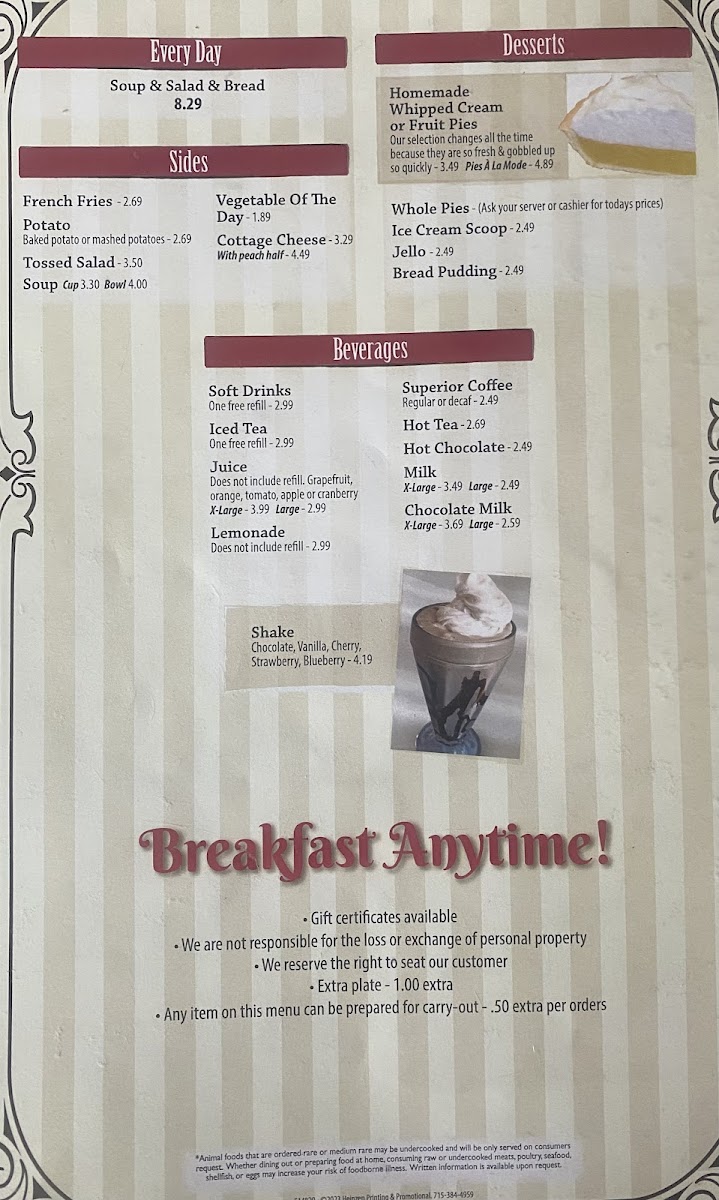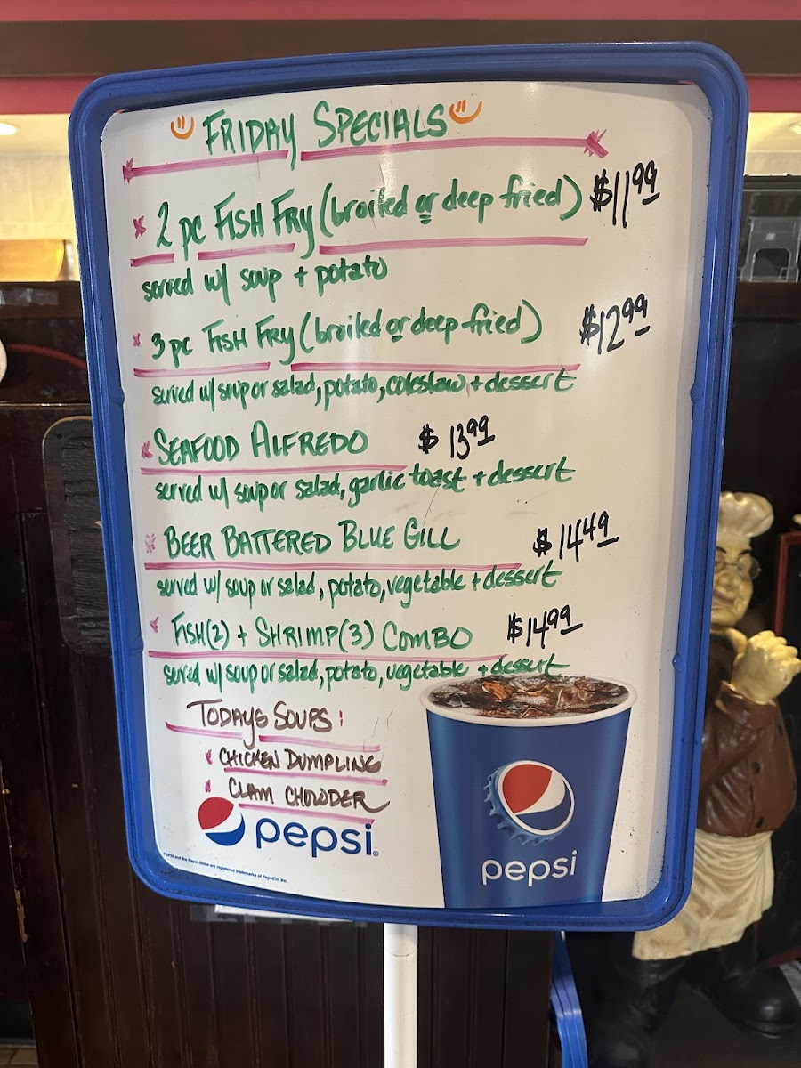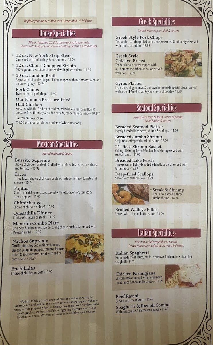 Breaded pork tenderloin, choice of soup or salad. Select baked, mashed, or French fried potatoes. Dessert options include tapioca pudding, ice cream, or bread pudding.