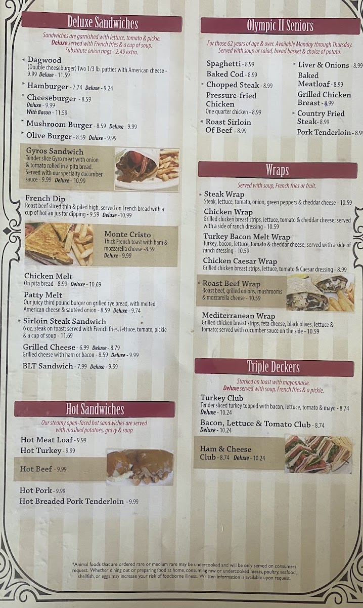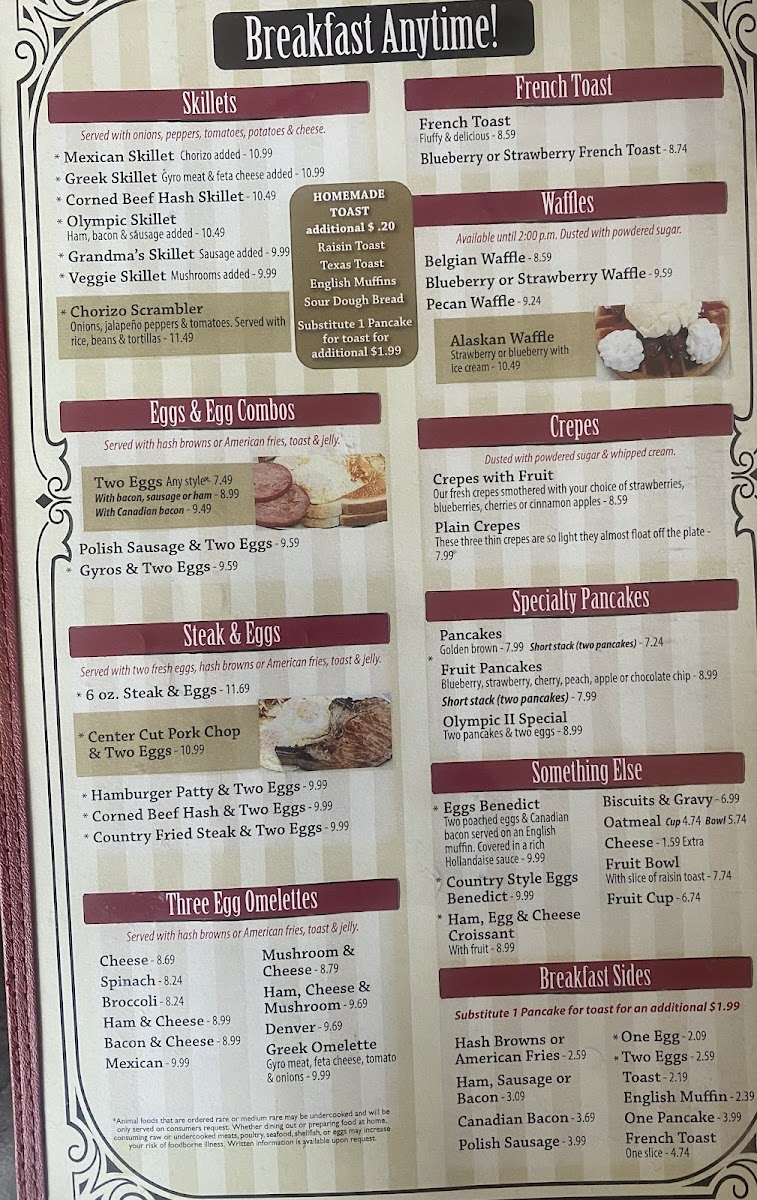Animal foods that are ordered rare or medium rare may be undercooked and will be only served on consumer's request. Whether dining out or preparing food at home, consuming raw or undercooked meats, poultry, seafood, shellfish, or eggs may increase your risk of foodborne illness. Written information is available upon request. Two pancakes and two eggs.